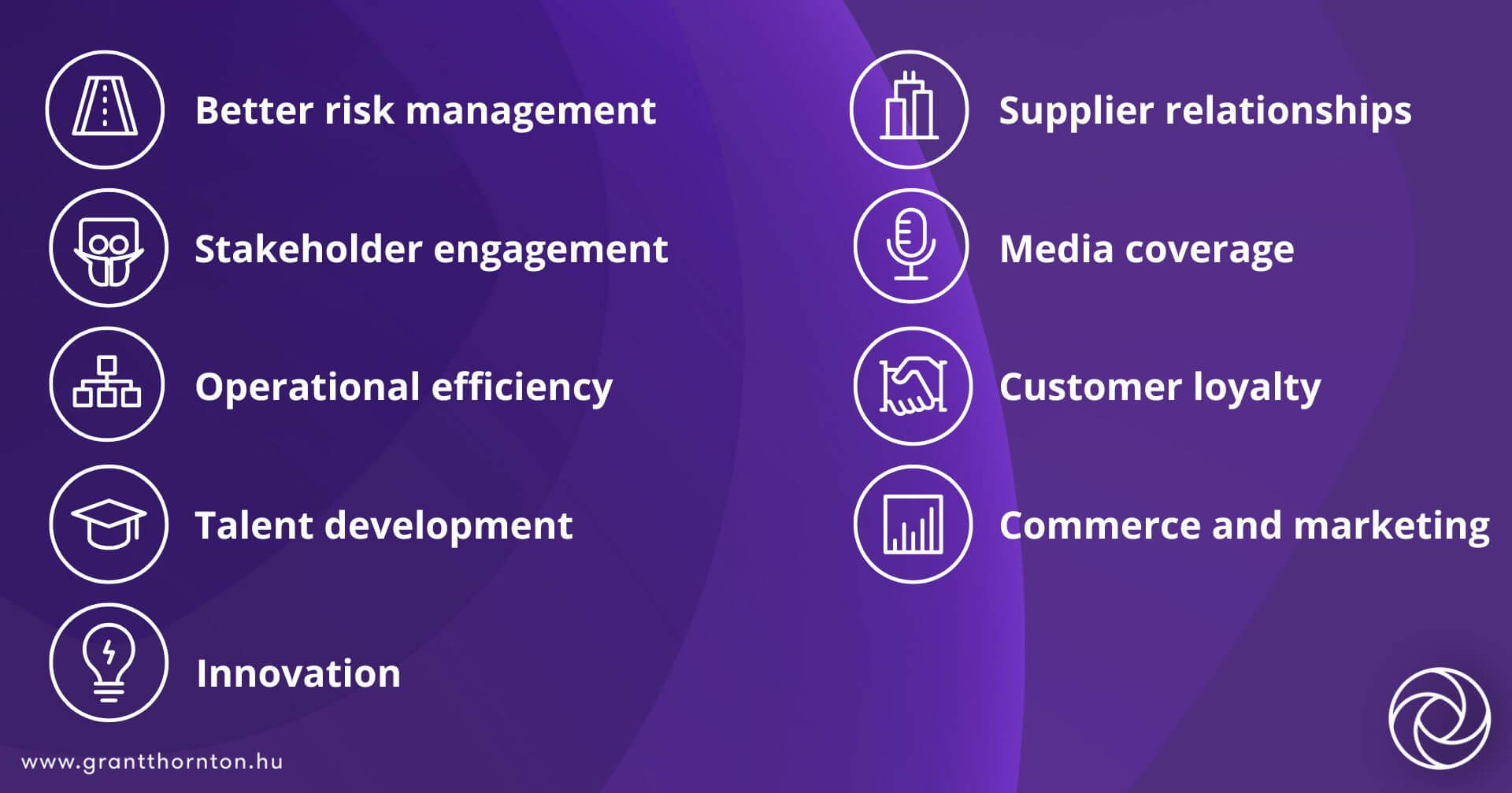 Third, identify the benefits arising from the measures and practices. Use the list of intermediary factors described in the introduction. For example: does switching to renewable energy improve customer loyalty, support the retention of employees increasingly committed to sustainability, or help avoid potential fines? This analysis may require a cross-functional team to ensure all benefits are identified.